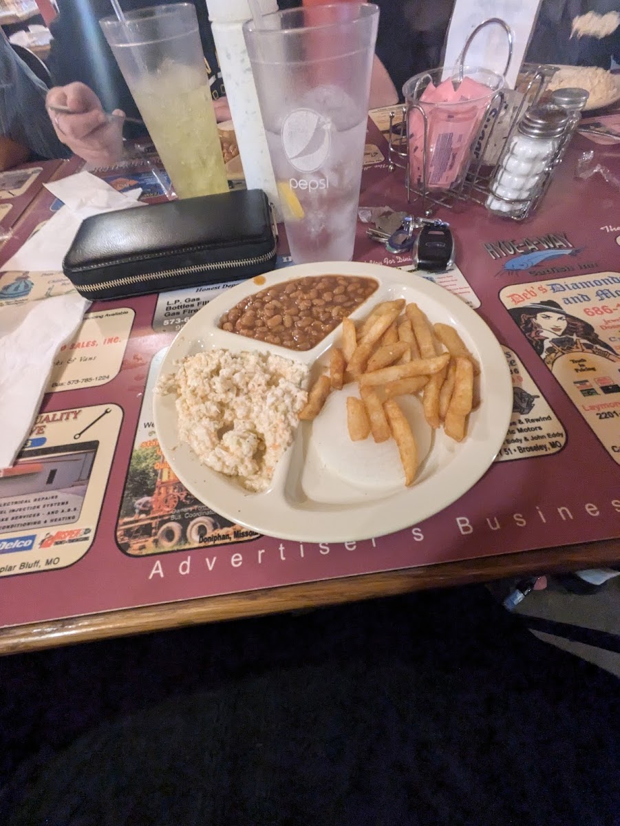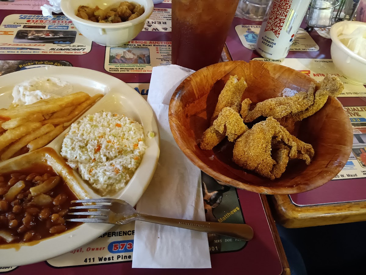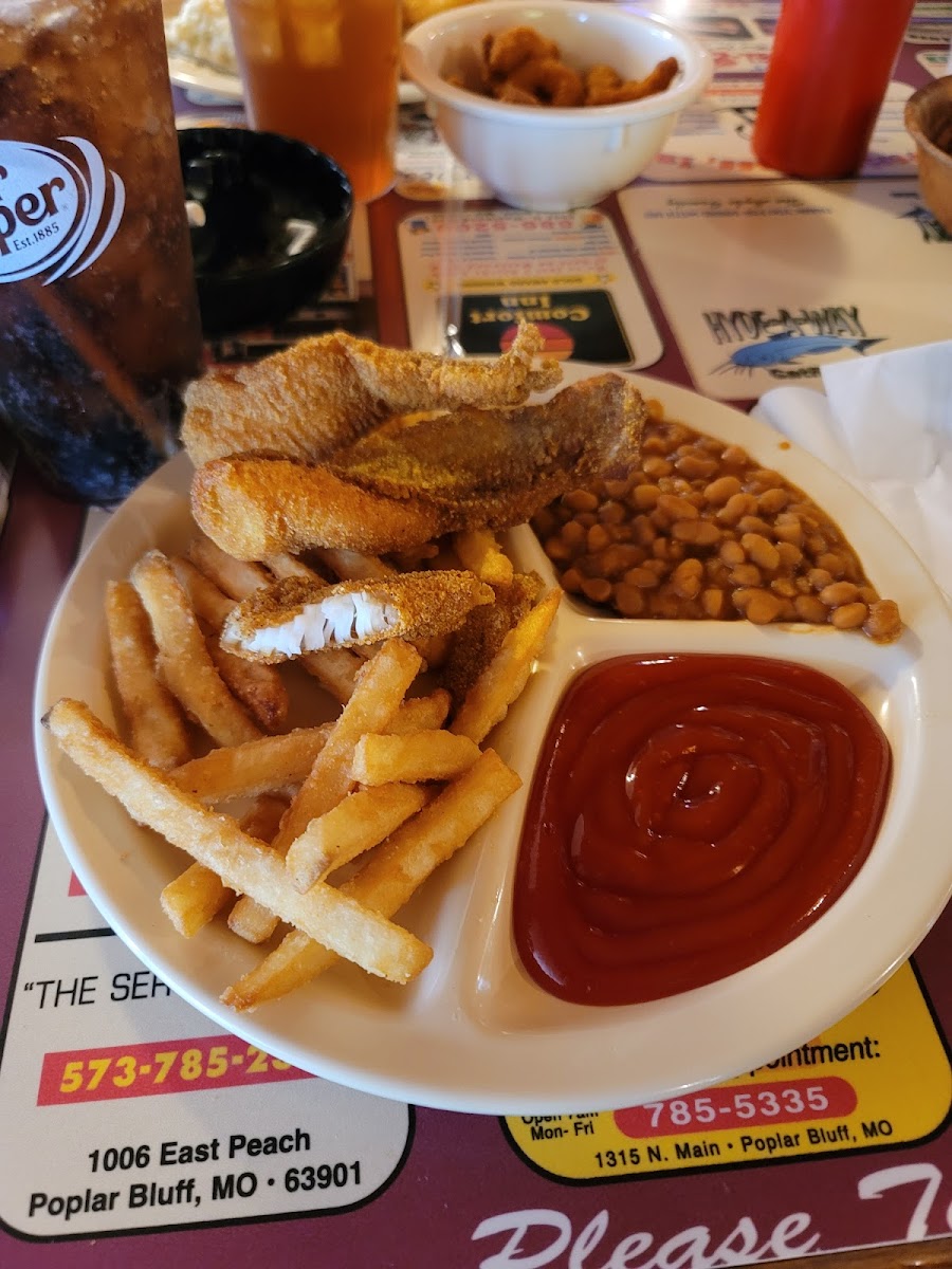 Am a 1st timer to Missouri and especially Catfish and I tell you what! I was really really good. A light moist, breaded deep fried filet. Topped off with fresh onions or their homemade tartar sauce baked beans tangy honey flavor with home style coleslaw with fries & little hushpuppy was a top choice. Didn't try the shrimp ( Allergy reasons) My mother in law said it was really tasty. Service and hospitality was amazing. Id for sure go back.